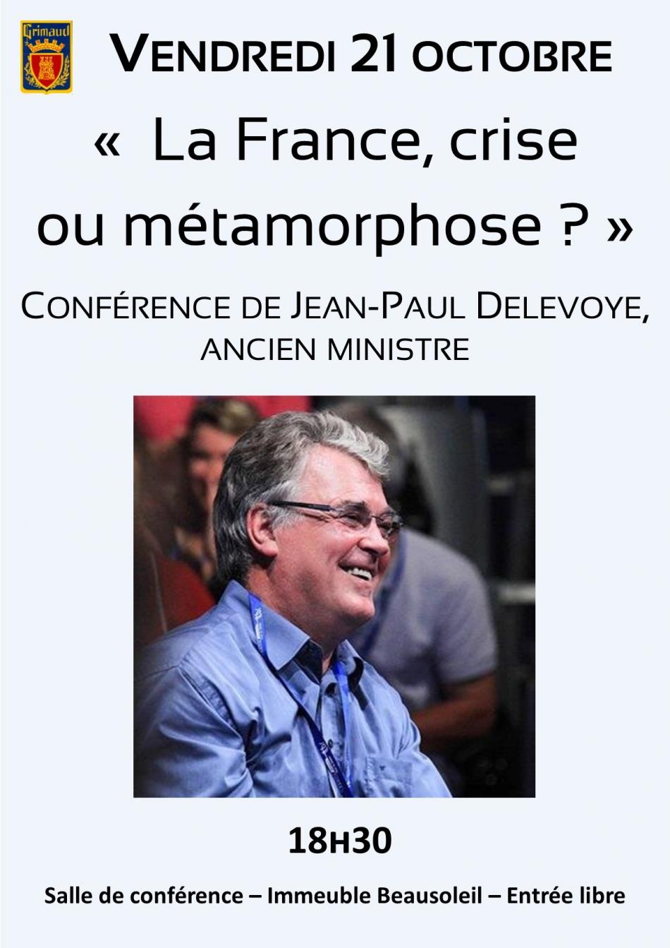 La conférence de Jean Paul DELEVOYE vendredi soir à Grimaud était très intéressante et instructive. Le thème en était "La France, crise ou métamorphose?". Dommage qu'il n'y avait pas plus de jeunes car cette conférence s'adressait particulièrement à eux et à leur avenir.