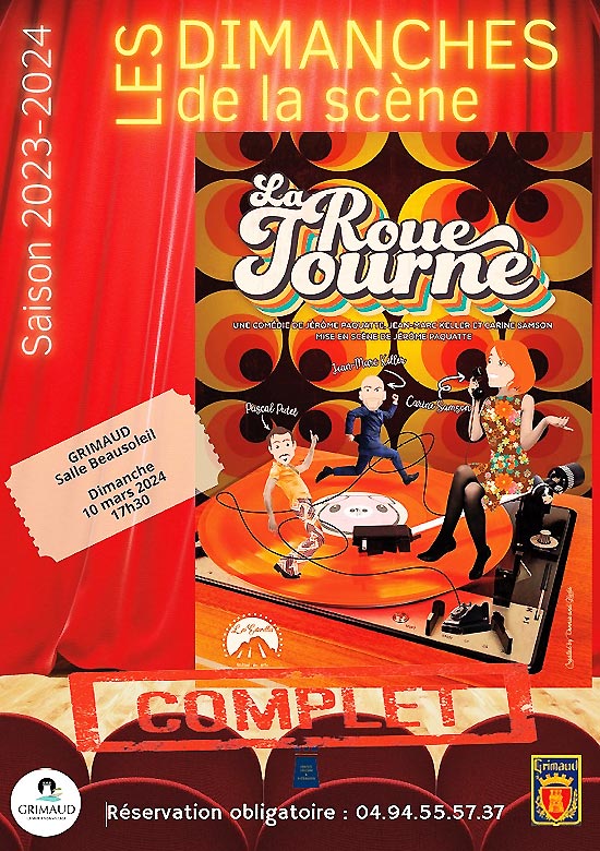 Décidement, c'est encore complet ! Les 'Dimanches de la scène' s'enchainent avec toujours un immense succés. Peut être que les organisateurs devraient réfléchir à trouver une salle plus grande. En attendant, peut être qu'en téléphonant, on peut espérer trouver une place suite à un désistement ou se présenter sur place. On ne sait jamais... Une comédie "La roue tourne" se jouera sur la scène de la Salle Beausoleil