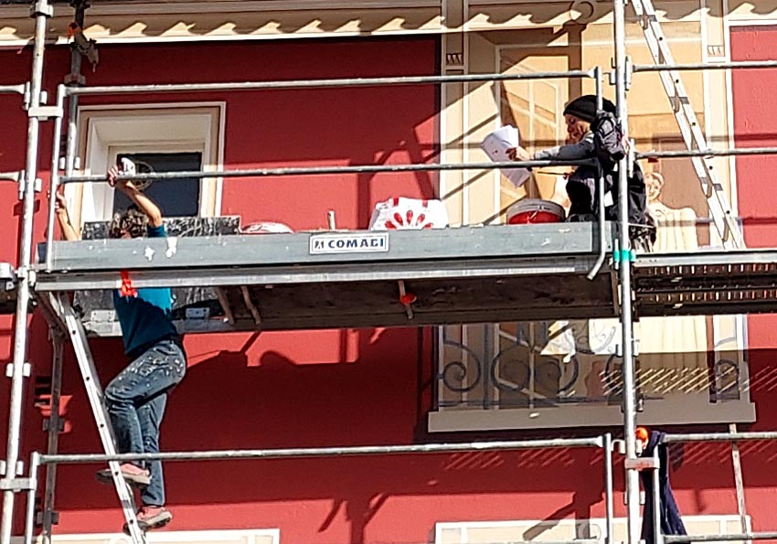 Jeudi 3 février 2022 : La provençale :Les travaux avancent place du Marché et la partie la plus difficile à faire à commencé : les trompe-l'oeil qui font la beauté de ces façades. 2 artistes se sont lancés dans cette rénovations très délicaes dont la célèbre "provençale au balcon"...